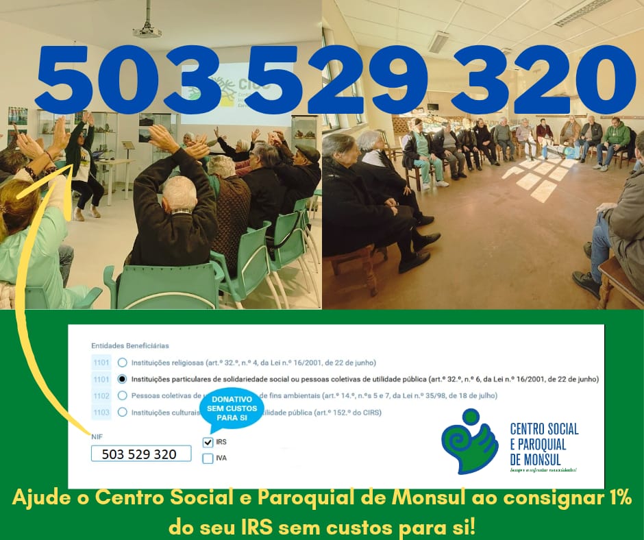 Ajude o Centro Social e Paroquial de Monsul ao consignar 1% do seu IRS sem custos para si.
